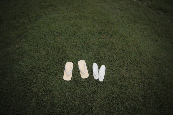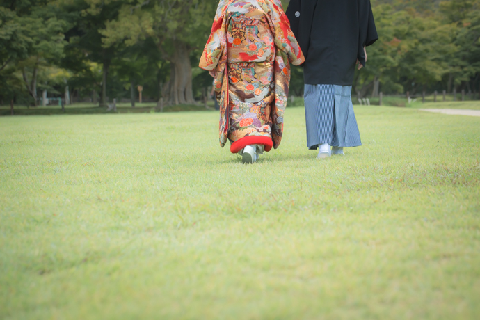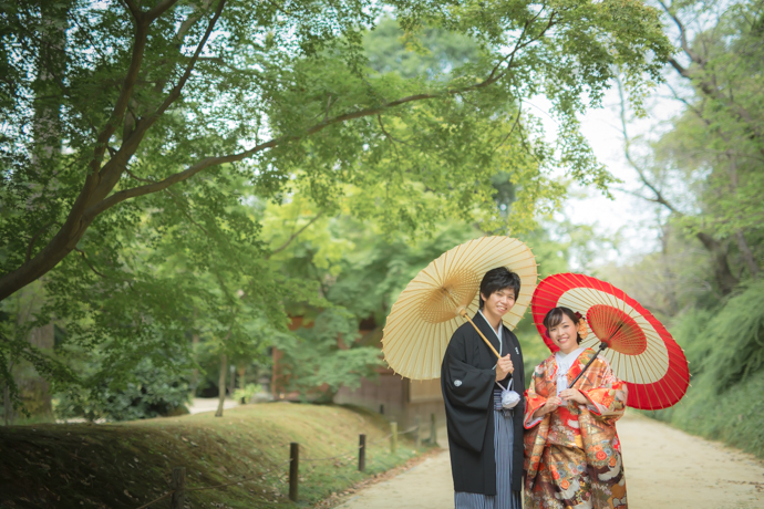 前撮りで初めて後楽園を訪れたお二人。暑さも和らいだ当日は和装でも過ごしやすく、まだ青々しい緑の中で撮影しました。
